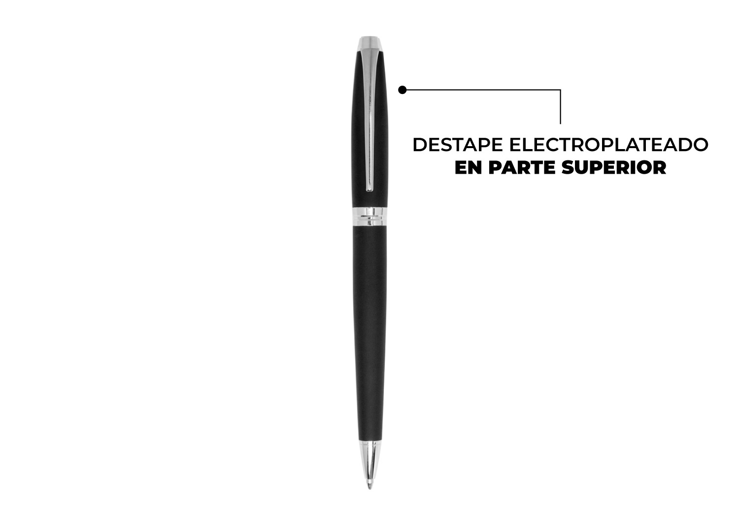 - ESFERO (BOLIGRAFO) Cuerpo color negro engomado. Clip, puntera y detalles en color plata. Apertura giratoria. Con estuche de cartón. Destape electroplateado en la parte superior.