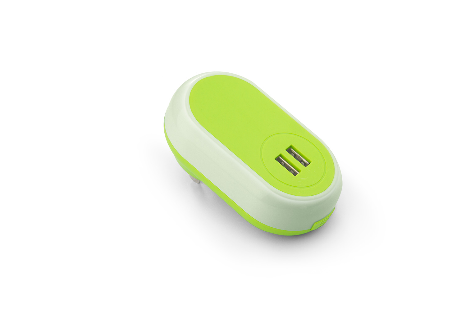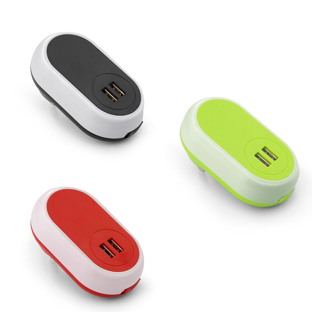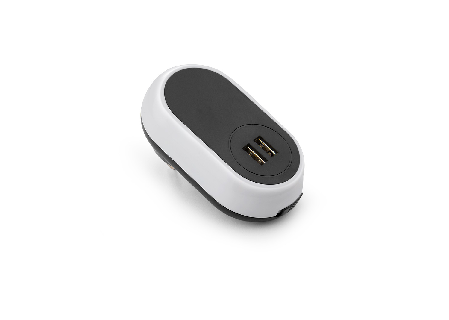 • Cargador de pared con doble puerto USB y luz nocturna. Salida 5V-2.1A