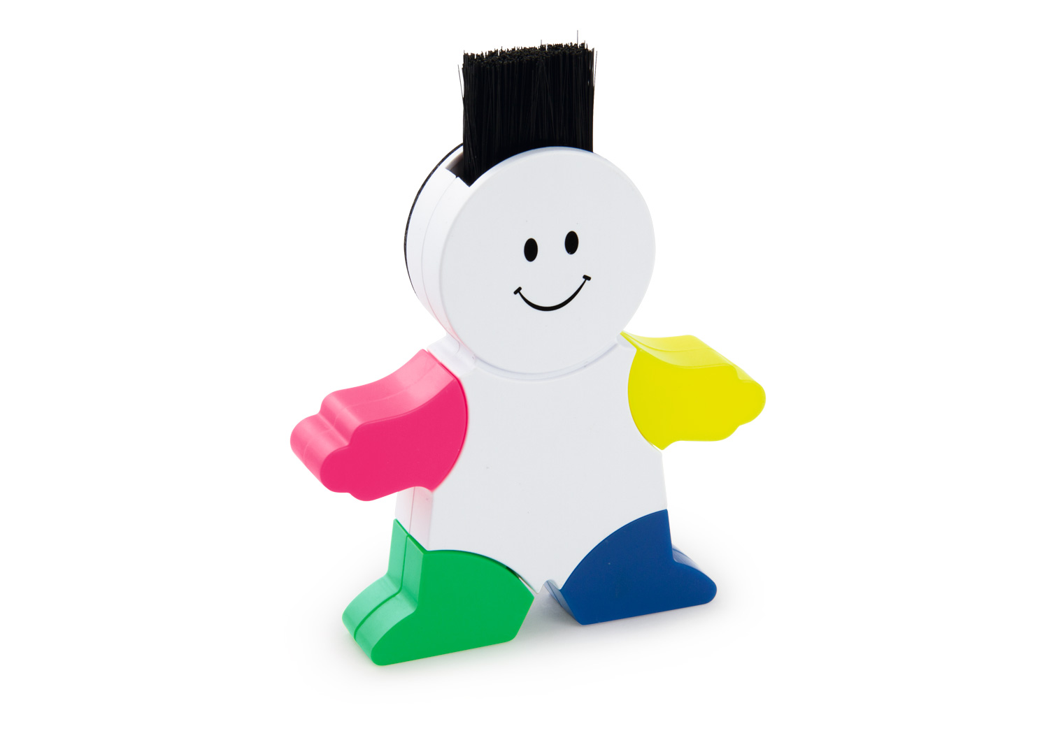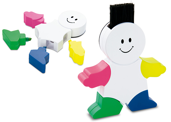 - Juego de 4 resaltadores de colores con base en forma de niño y cepillo para limpiar el teclado.