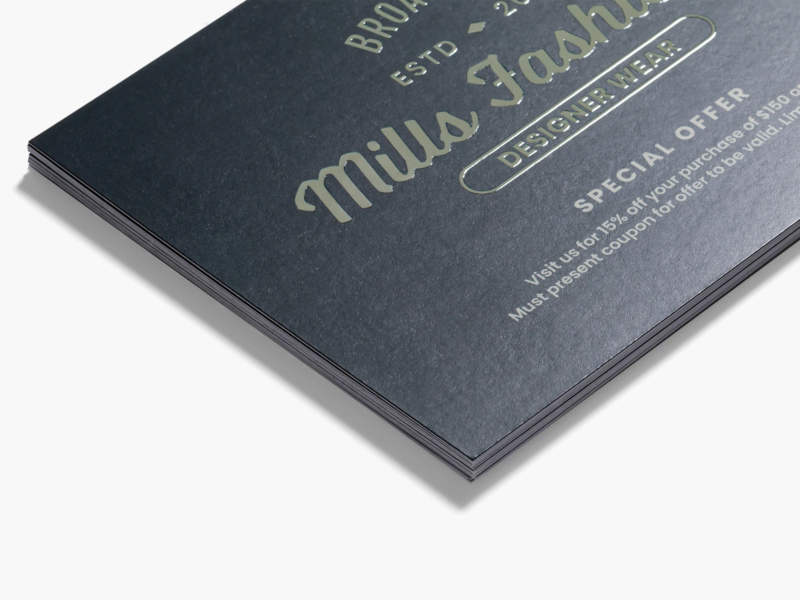 Want to give your message a touch of oomph? Try our embossed gloss postcards. They feature a shiny and raised layer on selected areas of your front design. The glossy layer contrasts the matte paper, highlighting your logo and key information. The result can be hard to miss: A stunning visual effect that attracts attention and a delightful texture your contacts would want to glide their fingers over.
